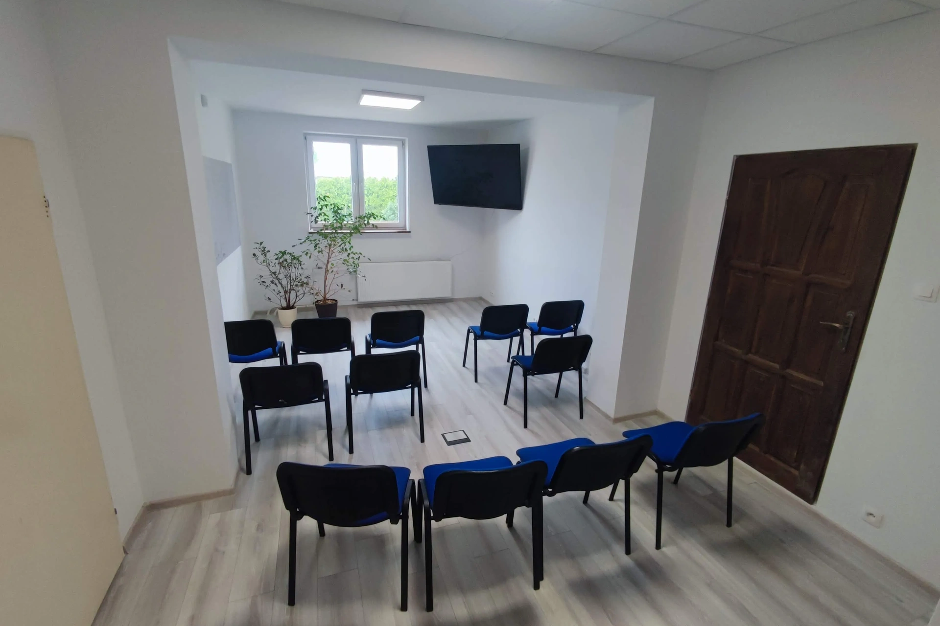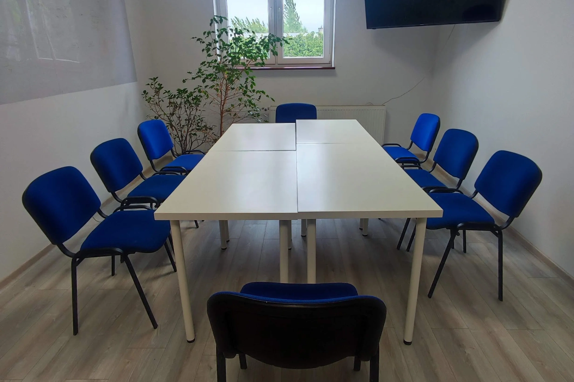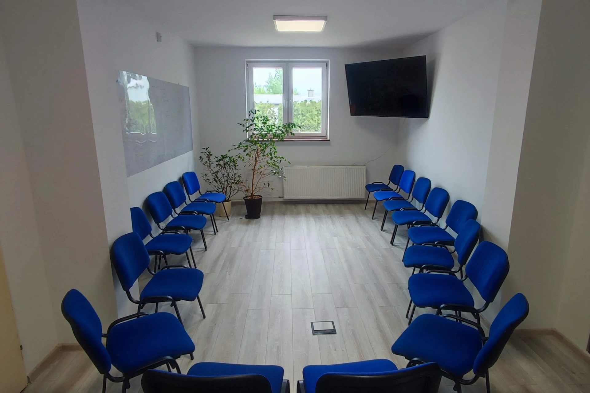 Salka szkoleniowo-konferencyjna Szkoleniowa przestrzeń na godziny Obiekt dysponuje niewielką (10-12 osób) salką konferencyjną wyposażoną z monitor 65". Salka może pełnić również role sali szkoleniowej. Masz pytania? Napisz lub Zadzwoń